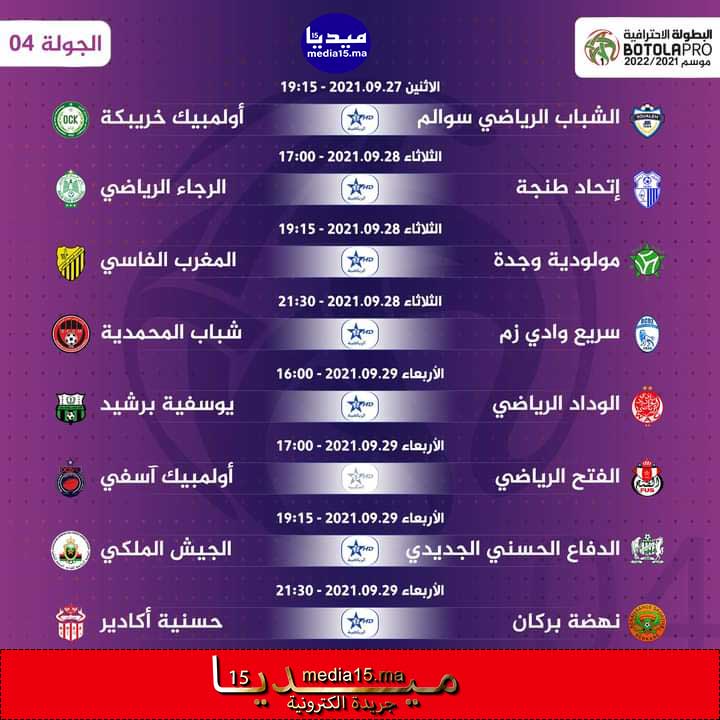 سيتم نقل اطوار مباريات البطولة الاحترافية لانوي ،للجولة الرابعة على القناة الرياضية المغربية وفق الجدول اسفله