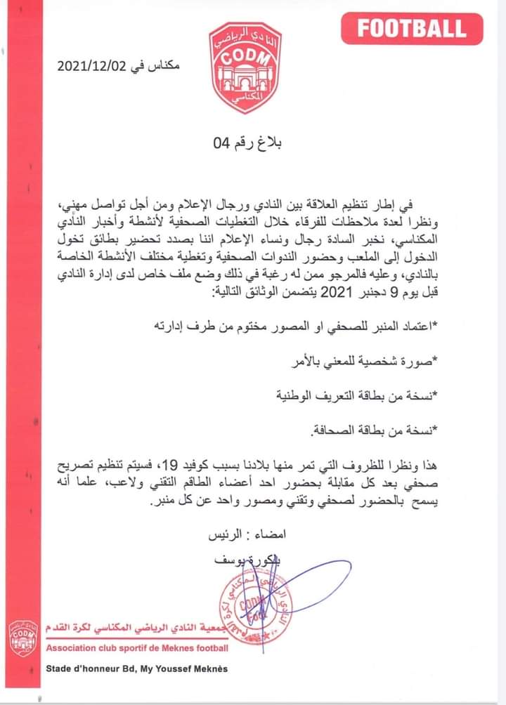 واشترطت إدارة النادي، ضمن البلاغ ذاته، بأنه يتوجب على من له الرغبة في ذلك وضع ملف خاص لدى الأخيرة قبل يوم 9 دجنبر 2021، يتضمن الوثائق التالية، اعتماد المنبر الصحفي أو المصور مختوم من طرف إدارته، وصورة شخصية للمعني بالأمر، ونسخة من بطاقة التعريف الوطنية، ونسخة من بطاقة الصحافة.