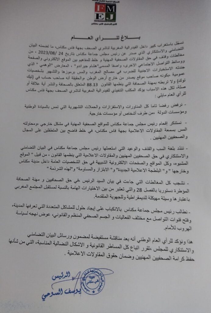 - يندد بلغة السب والقذف والوعيد التي استعملها رئيس مجلس جماعة مكناس في البيان التضامني والاستنكاري في حق الصحفيين المهنيين والمقاولات الاعلامية التي ينظمها القانون ، من قبيل ” الموقع المشبوه وكل المواقع والصفحات الالكترونية الشبيهة في حق الشخصيات العامة داخل مدينة مكناس وخارجها ” و ” البلطجة الاعلامية الجديدة” و ” الابتزاز والمساومة” و”لهذه الشرذمة “