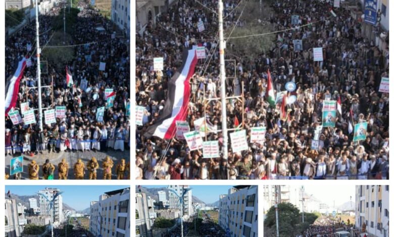 خرجت بالامس ، في محافظة إب”وسط اليمن” حشود هائلة في مسيرة ” الفتح الموعود والجهاد المقدس ” استمرارا لدعم الشعب الفلسطيني .