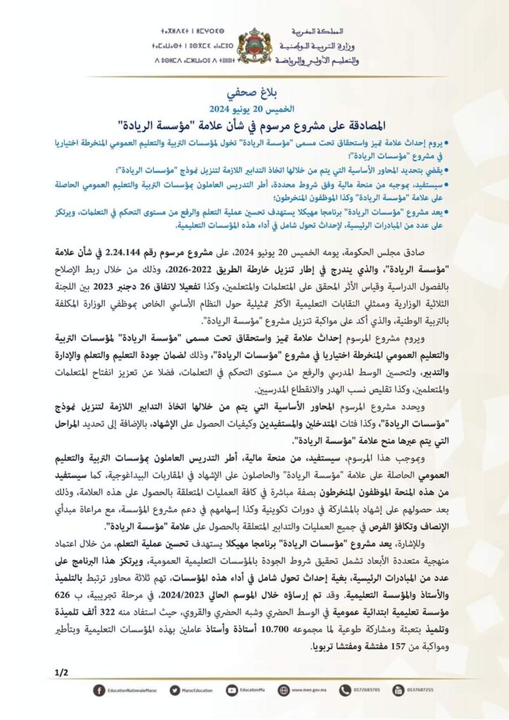 قدم السيد شكيب بنموسى، وزير التربية الوطنية والتعليم الأولي والرياضة، يومه الخميس 20 يونيو 2024، بمجلس الحكومة مشروع المرسوم رقم 2.24.144 في شأن علامة “مؤسسة الريادة”، حيث تم التداول بشأنه والمصادقة عليه من طرف الحكومة.