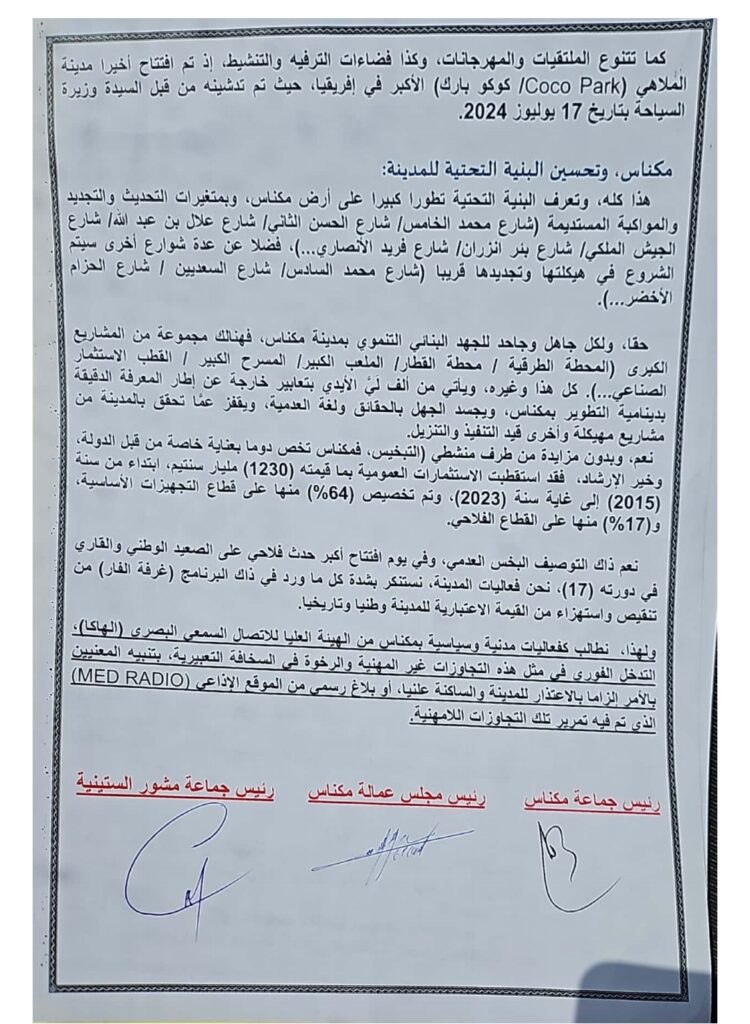 في تصريح توضيحي أصدره كل من رئيس جماعة مكناس ، ورئيس المجلس الإقليمي، ورئيس جماعة مشور استينية ، تم توجيه خطاب خاص إلى الإعلامي رضوان الرمضاني وفريق برنامجه “غرفة الفار”، الذي تم بثه على إذاعة “MED RADIO” في 21 أبريل 2025. وجاء هذا البيان ليؤكد على أهمية دقة الوصف الإعلامي والموضوعية في التعامل مع قضايا المدينة، التي تُعتبر رمزًا تاريخيًا وثقافيًا في المغرب